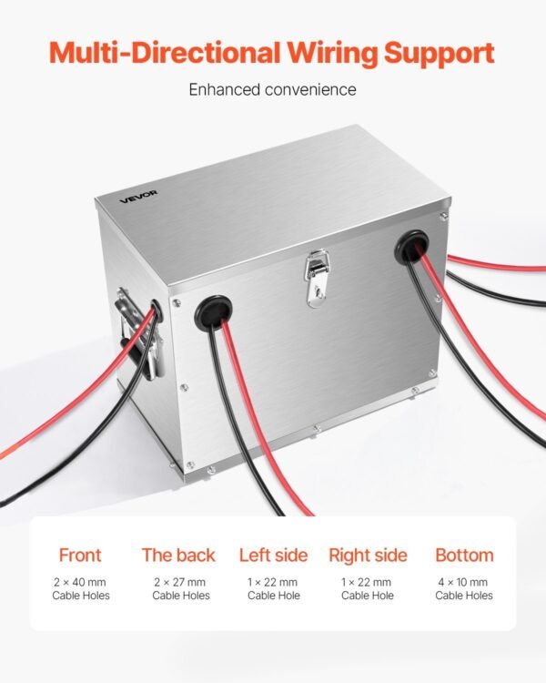 Sturdy and Reliable: The stainless steel battery box features a heavy-duty 201 stainless steel shell with excellent impact-resistant, corrosion-resistant ability, and high-temperature durability. It ensures long-term stable operation in harsh environments, making it ideal for enhancing equipment security and durability